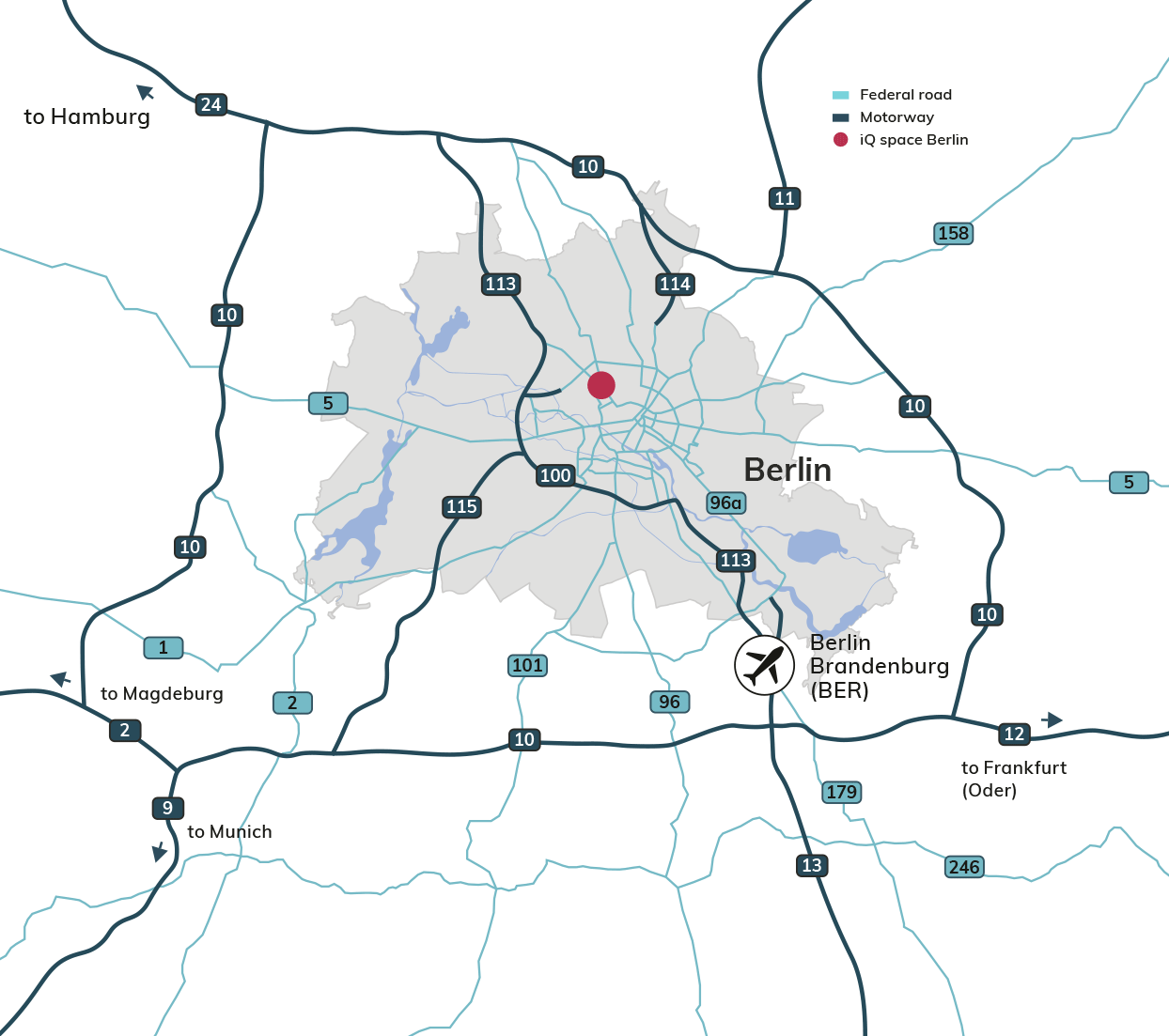 Located only a 10-minute travel time from Berlin's central railway station, iQ space Berlin-Mitte has recourse to an excellent urban infrastructure. The green banks of the River Spree and nearby Fritz-Schloss Park offer ideal settings for midday walks or quality time out after work.