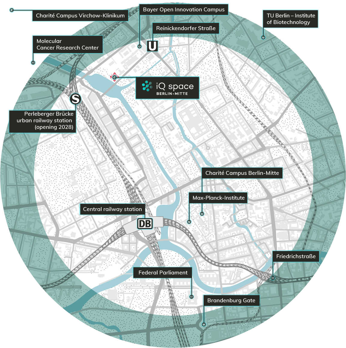 iQ space Berlin-Mitte is part of the Bayer Open Innovation Campus in the Nordhafen district. As such, it is ideally positioned at a highly dynamic life science site with access to outstanding expertise in the areas of R&D, production, approval and medicine.